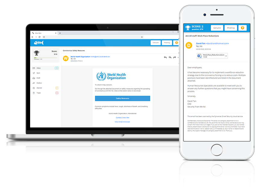This interactive phishing simulation duplicates an email client. Users are presented with a series of emails and have to classify them as either "phishing" or "genuine". Copies of actual phishing emails are used to safely expose users to them in a safe and controlled environment. Each email is fully explained with all phishing identifiers highlighted. Coronavirus scams, generic phishing and spear phishing examples are provided.